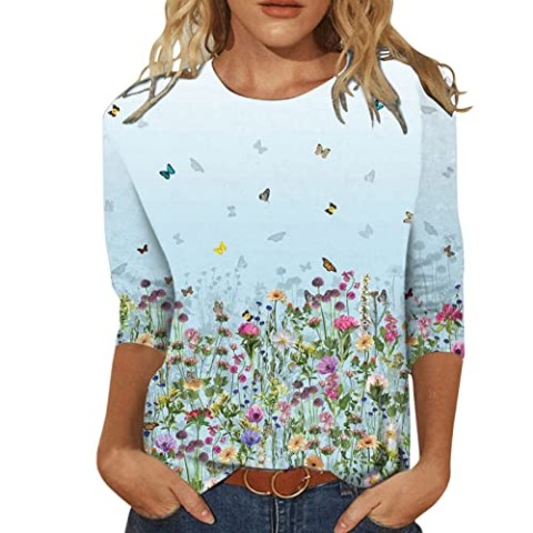 Lightweight floral print longline top with three-quarter sleeves, cotton blend, relaxed fit suitable for casual wear.