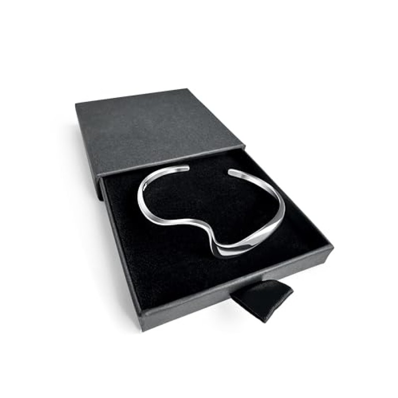 - Design: Unique wave shape with sculptural, modern open cuff style