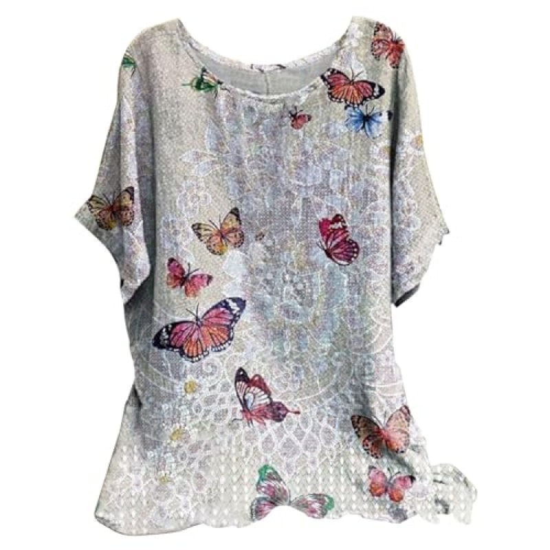 This tunic top from Angxiwan features a butterfly print and a classic round neckline designed for women. Made from a blend of 65% cotton and 35% polyester, the fabric is soft, lightweight, and stretchable, providing comfort and ease of movement. The short sleeves and true-to-size fit make it suitable for summer and other seasons.