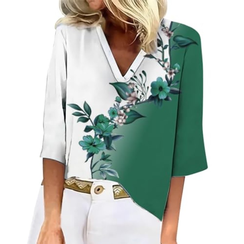 Angxiwan Women's Floral Print V-Neck Pullover Three-Quarter Sleeve Shirt