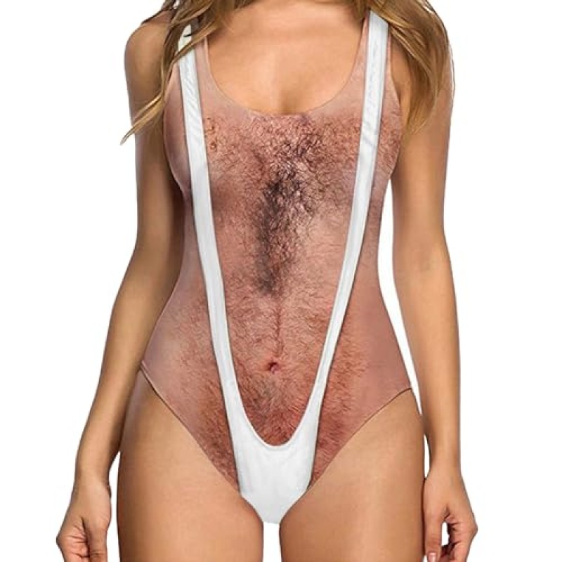 This Angxiwan women's one-piece swimsuit features a distinctive chest hair print design. It is made from a blend of 90% polyester and 10% spandex, offering durability, breathability, elasticity, and a smooth, skin-friendly feel for comfortable wear.