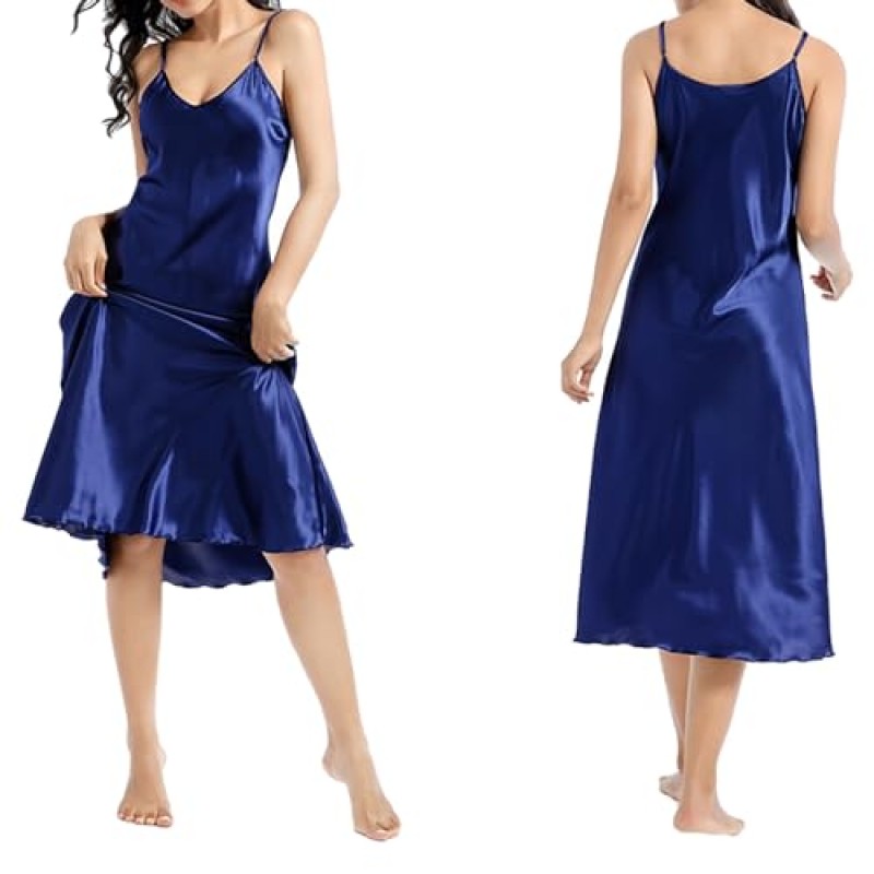 This Angxiwan women's satin nightdress features a smooth, lightweight satin fabric designed to drape softly against the skin, providing comfort for sleepwear or loungewear. The nightdress includes adjustable spaghetti straps for a customised fit and a flattering V-neckline paired with a ruffle hem and A-line silhouette, delivering a balance of elegance and casual style.