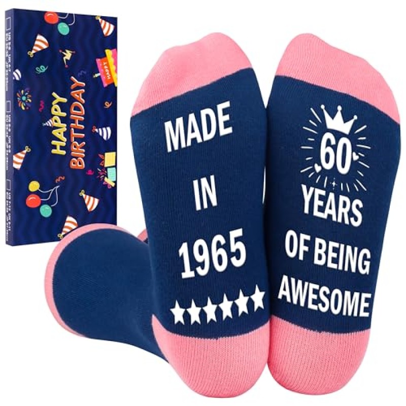 Belloxis 60th Birthday Grip Socks are designed as a practical gift option for women celebrating their 60th birthday, suitable for mothers, wives, sisters, or friends. These socks feature the phrase "MADE IN 1965, 60 YEARS OF BEING AWESOME" printed on the soles with non-slip lettering, providing added safety by preventing slips on smooth surfaces.