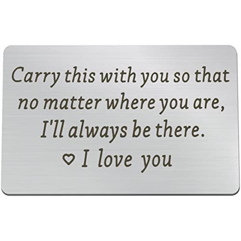 The card features romantic engraved messages, making it a meaningful token for long-distance relationships, with sentiments such as "Carry This with You So That No Matter Where You Are I'll Always Be There - I love you". It is a lightweight, compact keepsake that can be easily carried in a wallet.