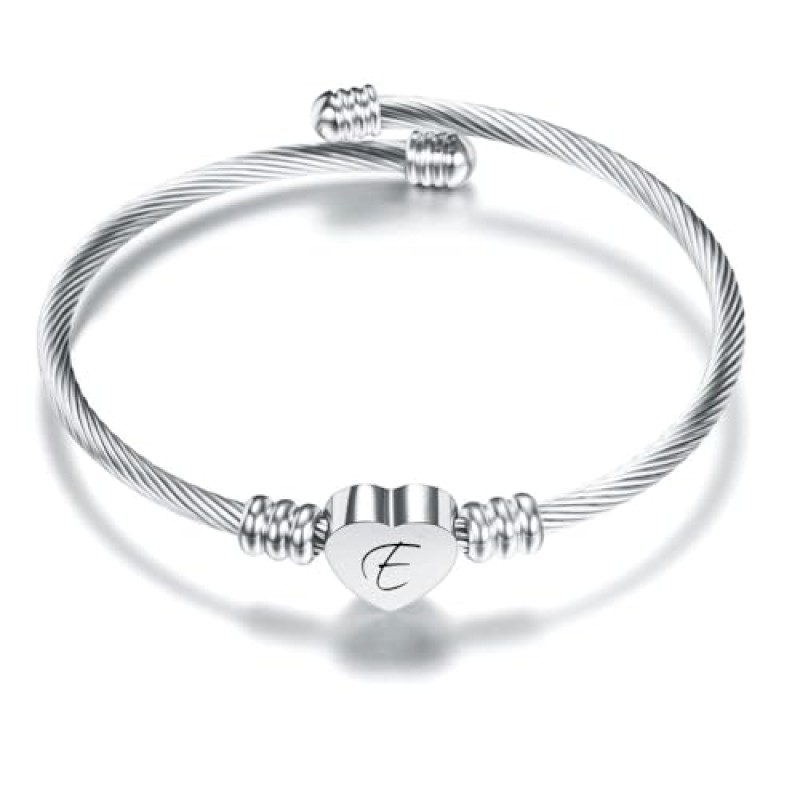 KENYG Silver Heart Alphabet Cuff Bracelet with Initial E