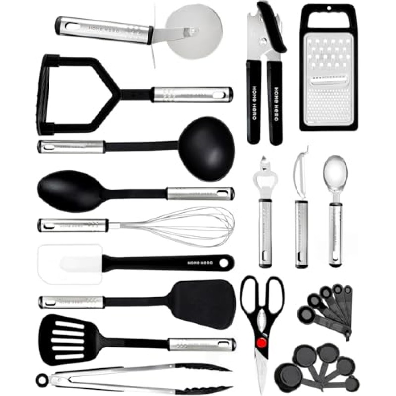 - Includes 25 kitchen utensils and gadgets covering cooking, serving, and measuring needs
