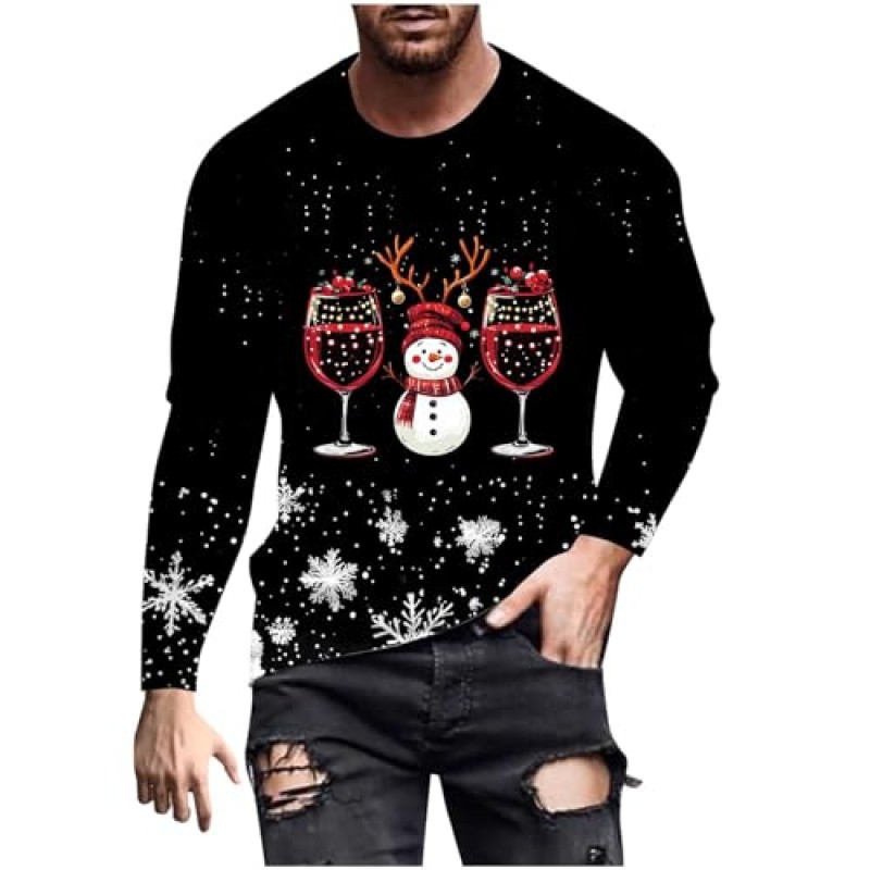 This men's Christmas jumper features a festive wine glass and snowman design, suitable for seasonal wear. Made for versatile use, it works well for casual wear, festive parties, office settings, and various social events throughout autumn, winter, and spring.