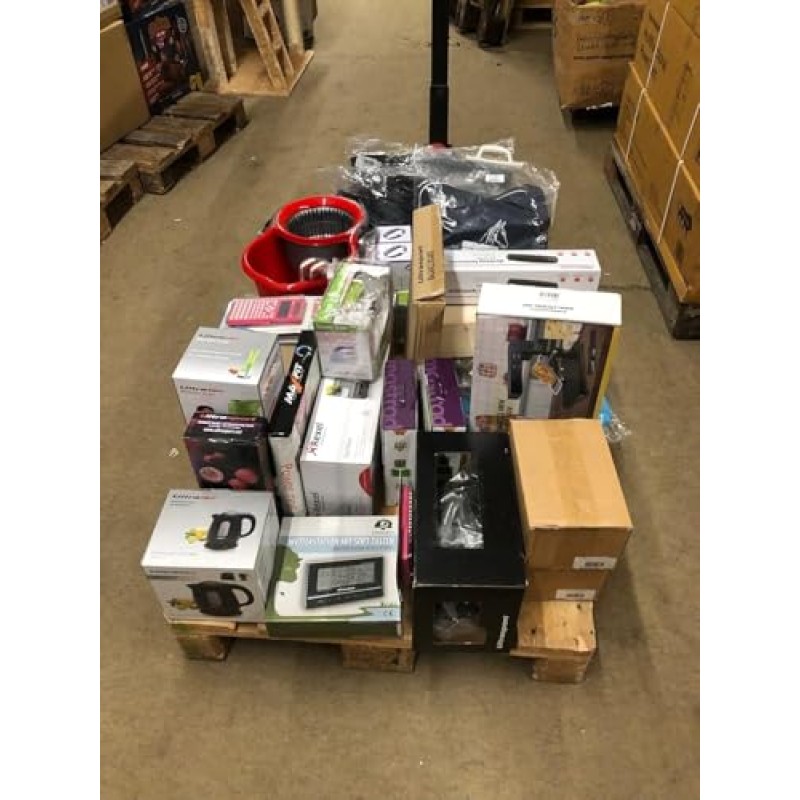 This product offers mixed pallets containing a variety of tools and home appliances, presenting an opportunity to acquire multiple items in bulk. Each pallet includes 5 to 30 pieces, suitable for resellers or businesses looking for diverse stock. The pallets consist of returns, providing a range of items that may vary in type and condition.
