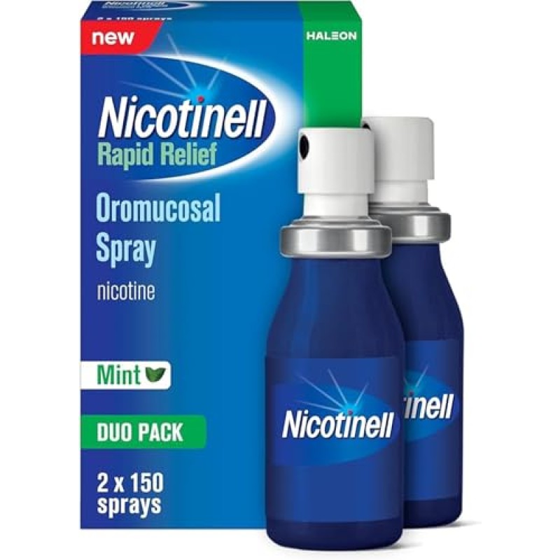Nicotinell Mint flavour nicotine spray is a medicinal product used as a stop smoking aid, providing relief of nicotine withdrawal symptoms. This mouth spray is also suitable for those looking to quit nicotine vaping. It offers fast craving relief starting in just 30 seconds with two sprays, making it the quickest absorbing product in the Nicotinell Range. The spray provides discreet on-the-go relief when the urge to smoke or vape strikes, mimicking the hand-to-mouth sensation of smoking. Clinically proven to double your chances of quitting smoking compared to willpower alone, this spray helps manage withdrawal symptoms like anxiety, frustration, restlessness, irritability, and cravings. It can be used alongside Nicotinell Patches for best results.