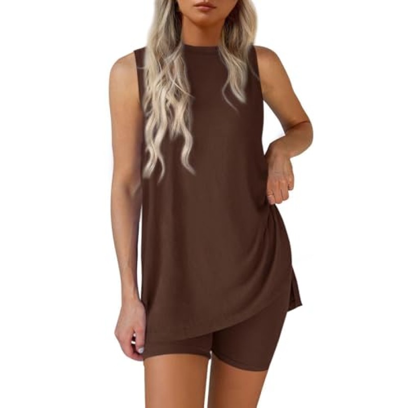 The tank top features side splits for added mobility and style, while the high-waisted shorts provide a comfortable fit. This set can serve multiple purposes including casual daily wear, sleepwear, sports outfit, or loungewear. Its versatile design means it can be worn for shopping, outdoor activities, or relaxed social occasions.