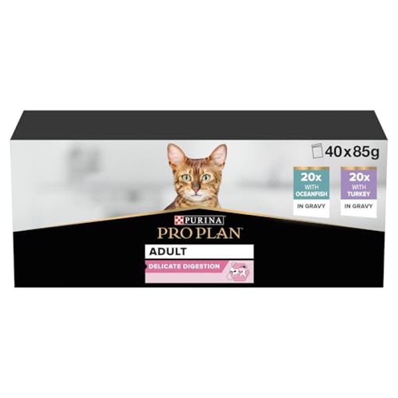 PRO PLAN Delicate Digestion Wet Cat Food Variety Pack provides a complete diet for adult cats with sensitive digestion and skin. The formulation includes tender pieces containing ocean fish and turkey in gravy, designed to support digestive health. High levels of omega 3 and 6 fatty acids help manage sensitive skin, contributing to overall coat and skin condition.