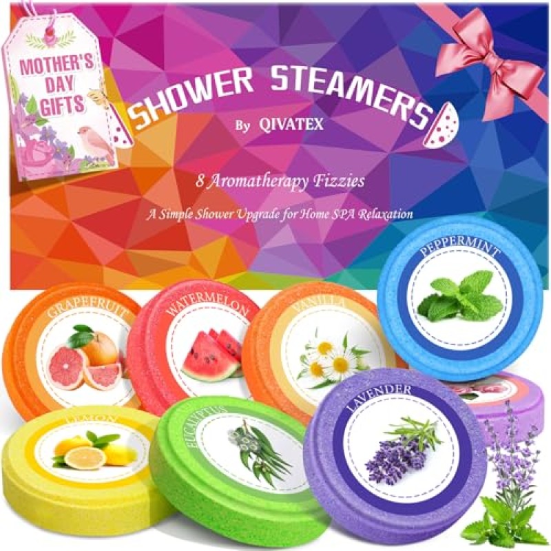 The Qivatex Aromatherapy Shower Steamers set includes eight individual steamers infused with a variety of natural essential oils such as lavender, eucalyptus, peppermint, grapefruit, rose, lemon, watermelon, and vanilla. These shower steamers are designed to release soothing aromas that transform a regular shower into a calming, stress-relieving experience.