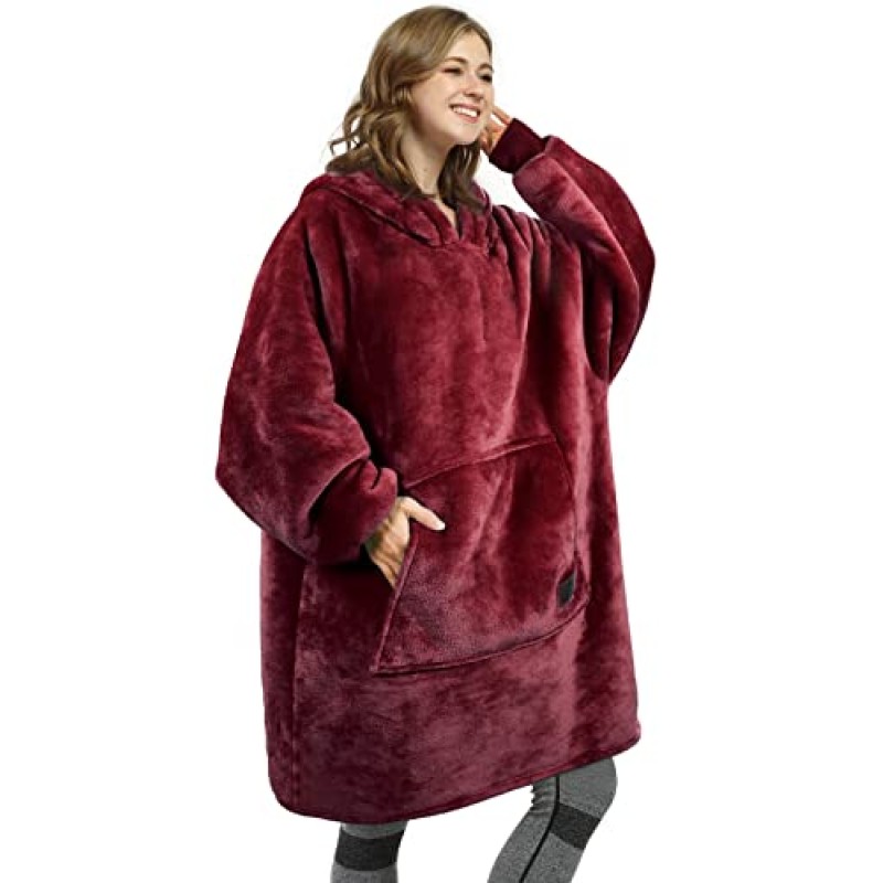 A large front pocket is integrated into the hoodie, suitable for storing items such as phones, snacks, or remote controls, and can also hold a hot water bottle for added warmth. The hoodie features a roomy, insulated hood with magnetic fasteners, useful for retaining heat during indoor or outdoor activities like camping or sports events. The blanket is machine washable and maintains its softness after cleaning.