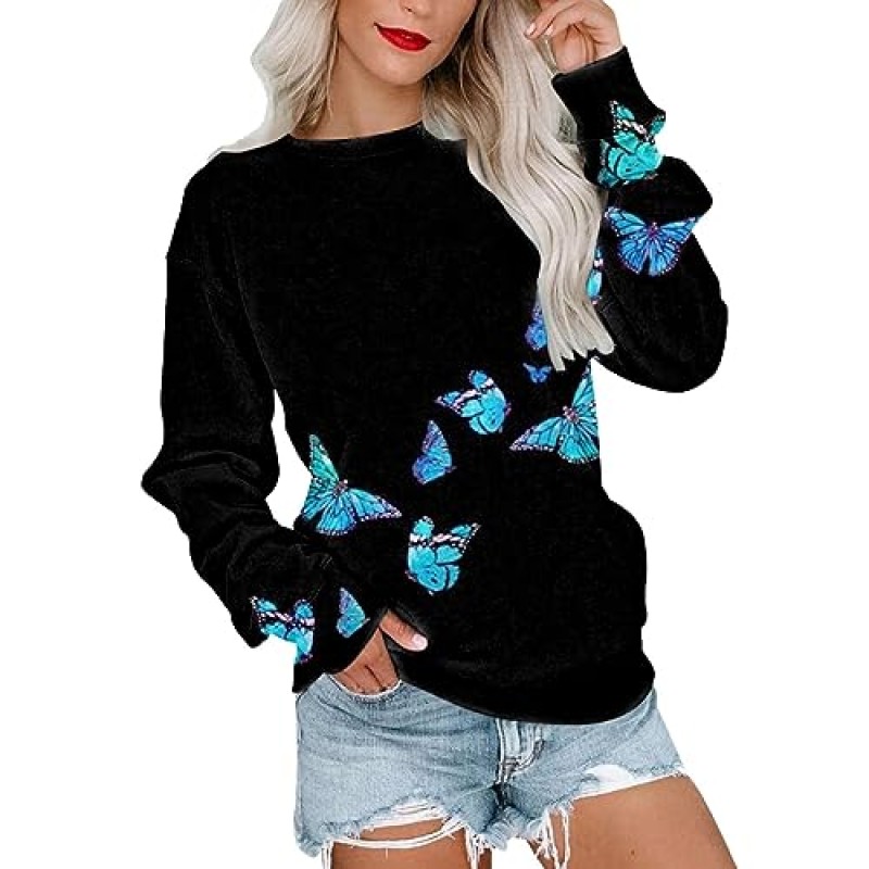 The sweatshirt features both a round and V neck style and fits true to size with a standard thickness. It is tailored to fit most female body shapes comfortably. The butterfly print adds a casual, trendy touch, making this sweatshirt easy to pair with jeans, leggings, or sweatpants for a versatile wardrobe addition.