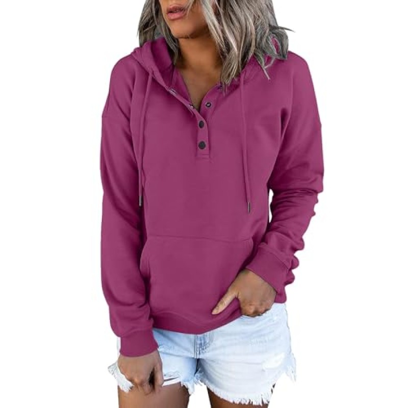 This women's casual hoodie features a V-neck design with button detailing and a practical front pocket, combining style and functionality. Made from polyester, the fabric offers durability and a comfortable fit for everyday wear.