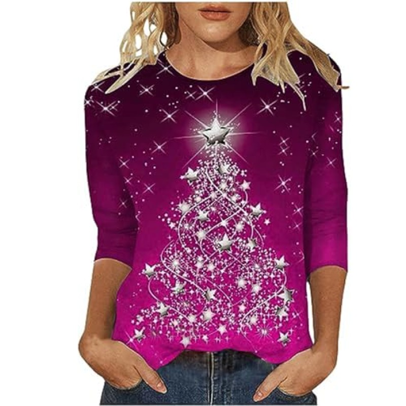This women's 3/4 sleeve T-shirt features a glitter Christmas tree print, combining festive style with casual comfort. Made from a blend of 65% cotton and 35% polyester, the fabric is soft, lightweight, and stretchable, providing comfort suitable for multiple seasons.