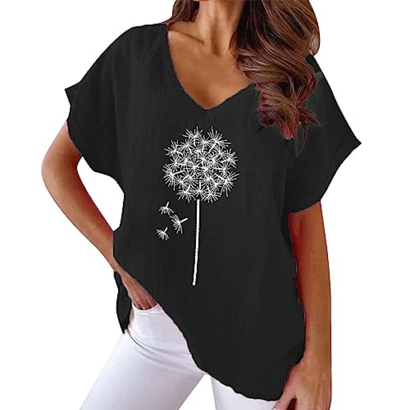 Women's Linen V-Neck T-Shirt with Dandelion Print