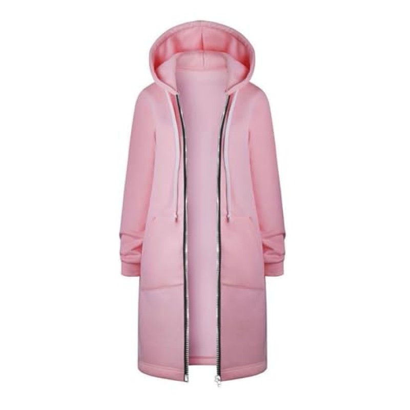 This women's long sleeve hoodie combines a cotton blend and fleece fabric for warmth during autumn and winter. It features a drawstring hood and zip fastening for adjustable comfort and protection against the cold. The garment includes practical side pockets and is designed in a casual loose style for everyday wear. Its knee-length and cropped zip-up design provide a versatile tunic-like fit suitable for pairing with leggings, boots, or heels.