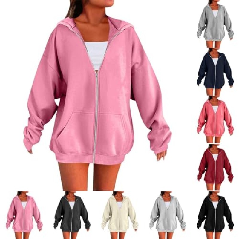 This oversized zip-up hoodie for women combines comfort and functionality with a casual style. It is crafted from a soft and breathable fabric blend of 85% polyester and 15% cotton, providing warmth without bulk across spring, autumn, and winter seasons.
