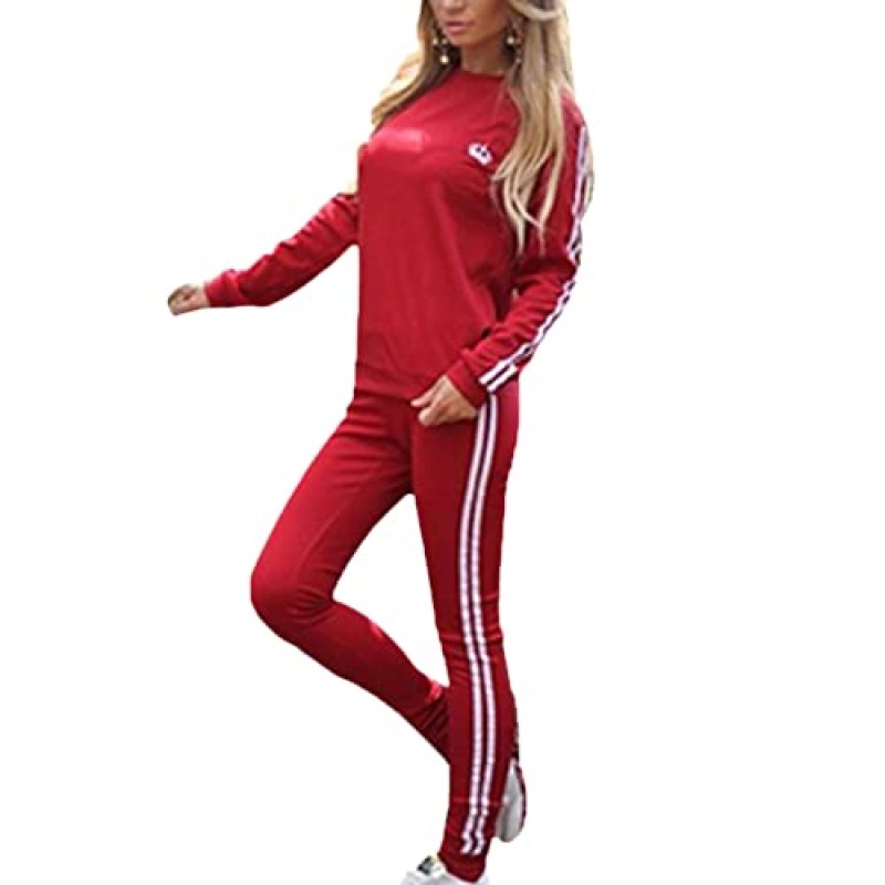 This women's tracksuit set includes a long sleeve top with an O neck and matching pants, both featuring side stripes for a sporty look. The set comes as two pieces, suitable for casual wear, exercise, fitness, running, or lounging. The tracksuit is designed for comfort and functionality with multiple size options ranging from UK 6/8 to UK 12/14, accommodating various bust, shoulder, sleeve, hip, top length, and pants length measurements to ensure a better fit.