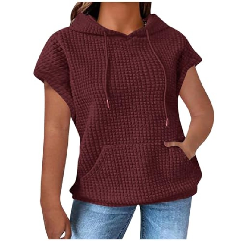 This tunic top features a waffle knit fabric providing a textured, breathable feel suitable for warmer weather. It has short sleeves and a hoodie design, combining casual style with comfort. The pullover style makes it easy to wear, while the tunic length offers coverage and versatility for pairing with different bottoms.
